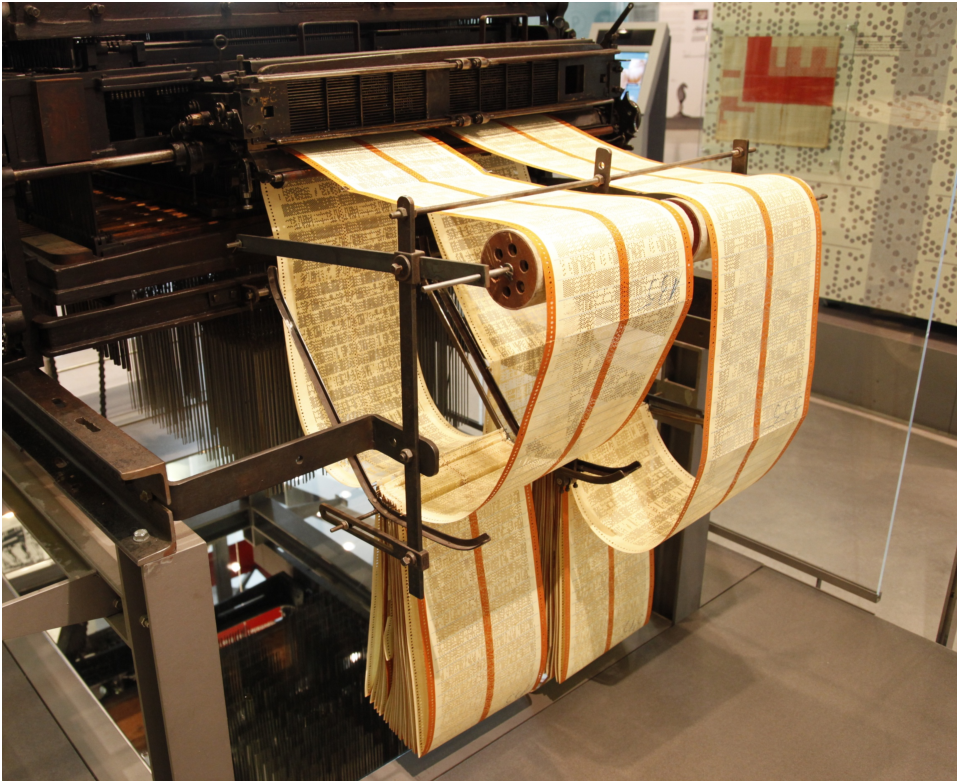 Figure 0.1: Jacquard control unit for a weaving loom, with its punched cards arranged in a loop. (CC BY-NC-SA, Heinz Nixdorf MuseumsForum.)