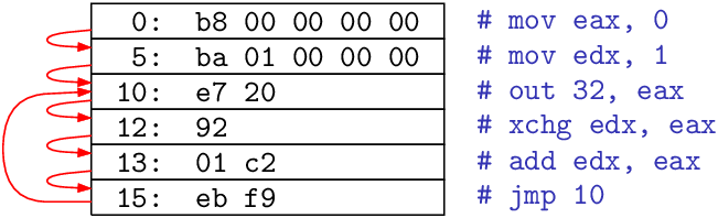 Figure 0.2: x86 machine code that computes Fibonacci numbers and sends them to output port 32. The flow of control is shown by the arrows on the left side. The jump at PC 15 to PC 10 creates an infinite loop.