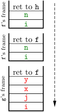 The stack growns down. The first call of f with argument 0, from another procedure h, say, pushes a frame with a return address into h and bindings for the variables n and i of f. Procedure f then calls itself recursively, pushing a second frame with a return address into f and bindings for n and i. The second activation of f, with argument 1, calls g, pushing the third frame shown at the bottom of the stack, with a return address in f and bindings for the variables and parameters of g.
